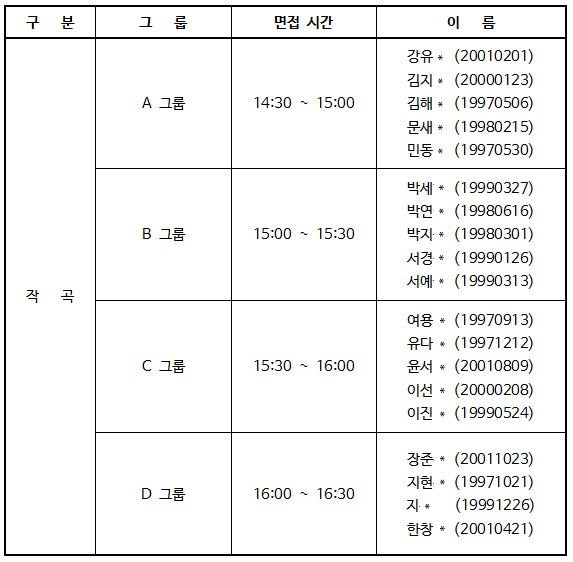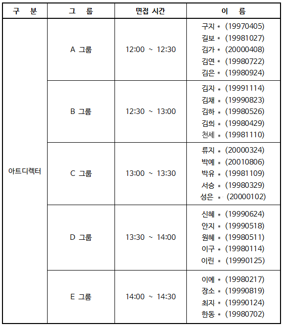 * 면접 시간은 개인 별로 다르니, 꼭 확인 부탁드립니다.