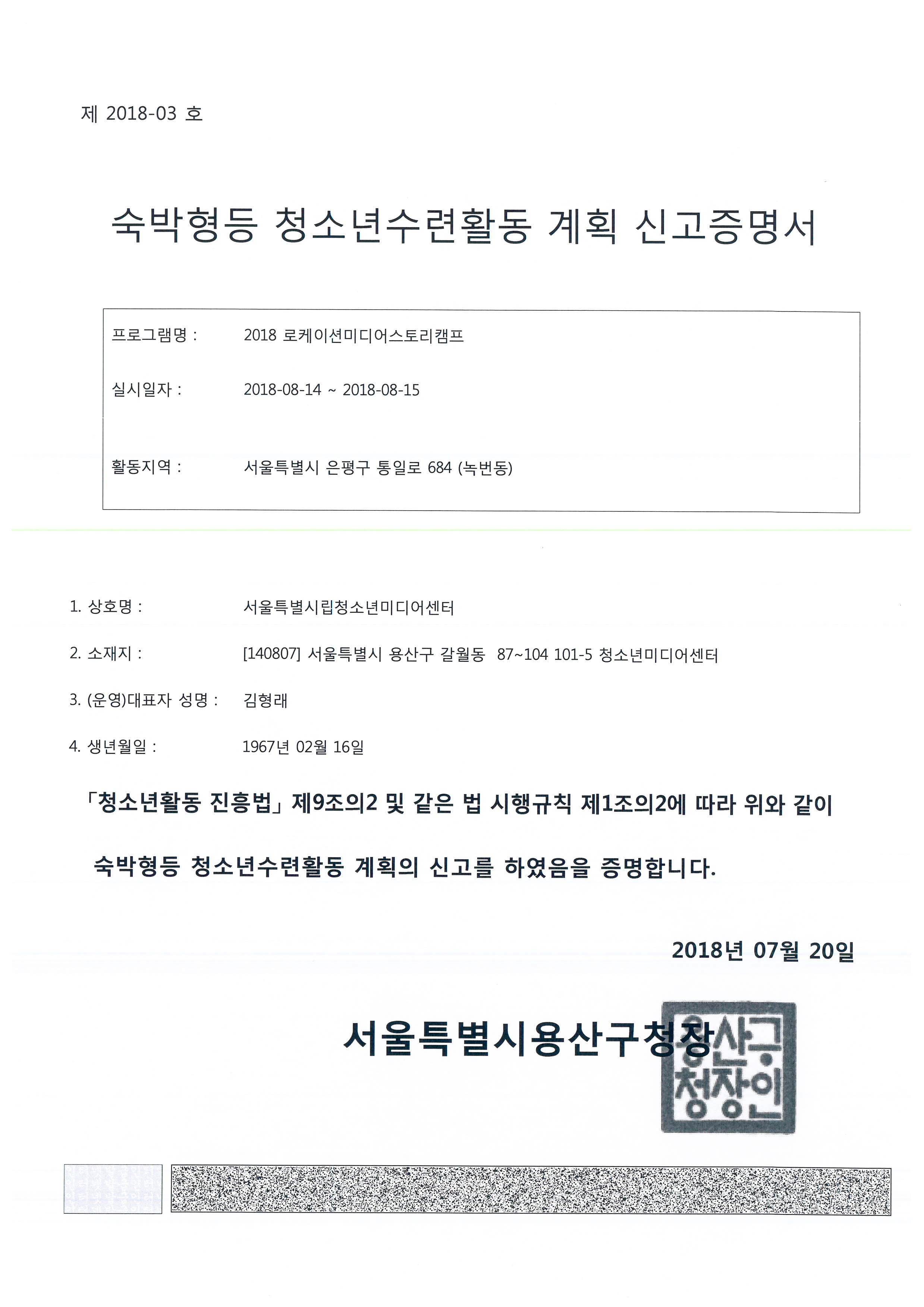 2018년 로케이션미디어스토리캠프와 관련하여 청소년 수련활동 신고내역을 고지합니다.