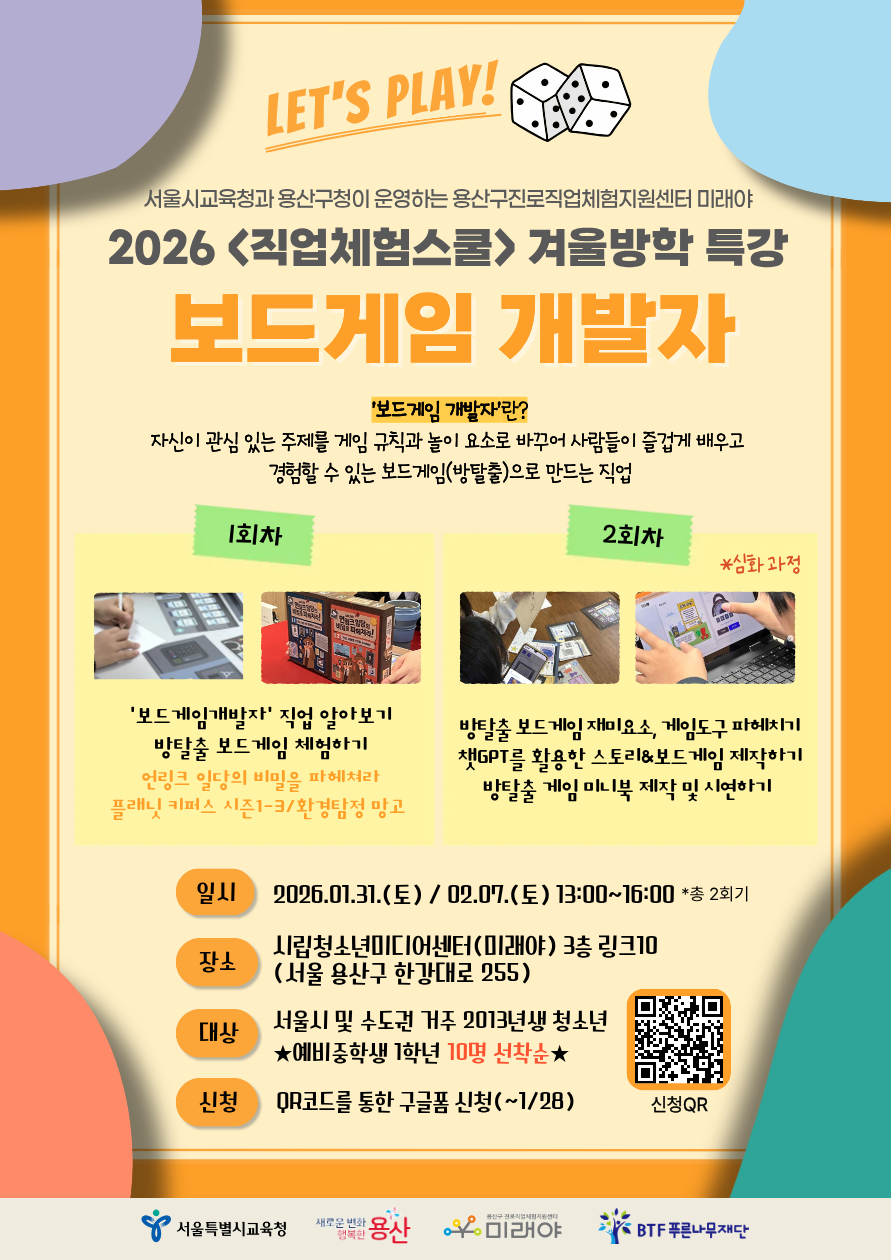 [모집] 2026 <직업체험스쿨> 겨울방학특강 - 보드게임제작자 체험 참가자 모집(~1/28)