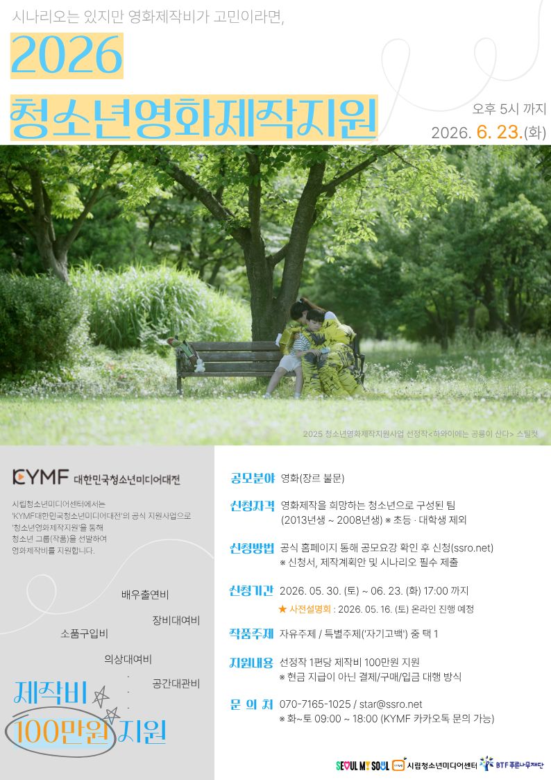 영화제작비가 필요한 청소년을 위한 <2026 청소년영화제작지원> 공모(~6/23 오후5시)