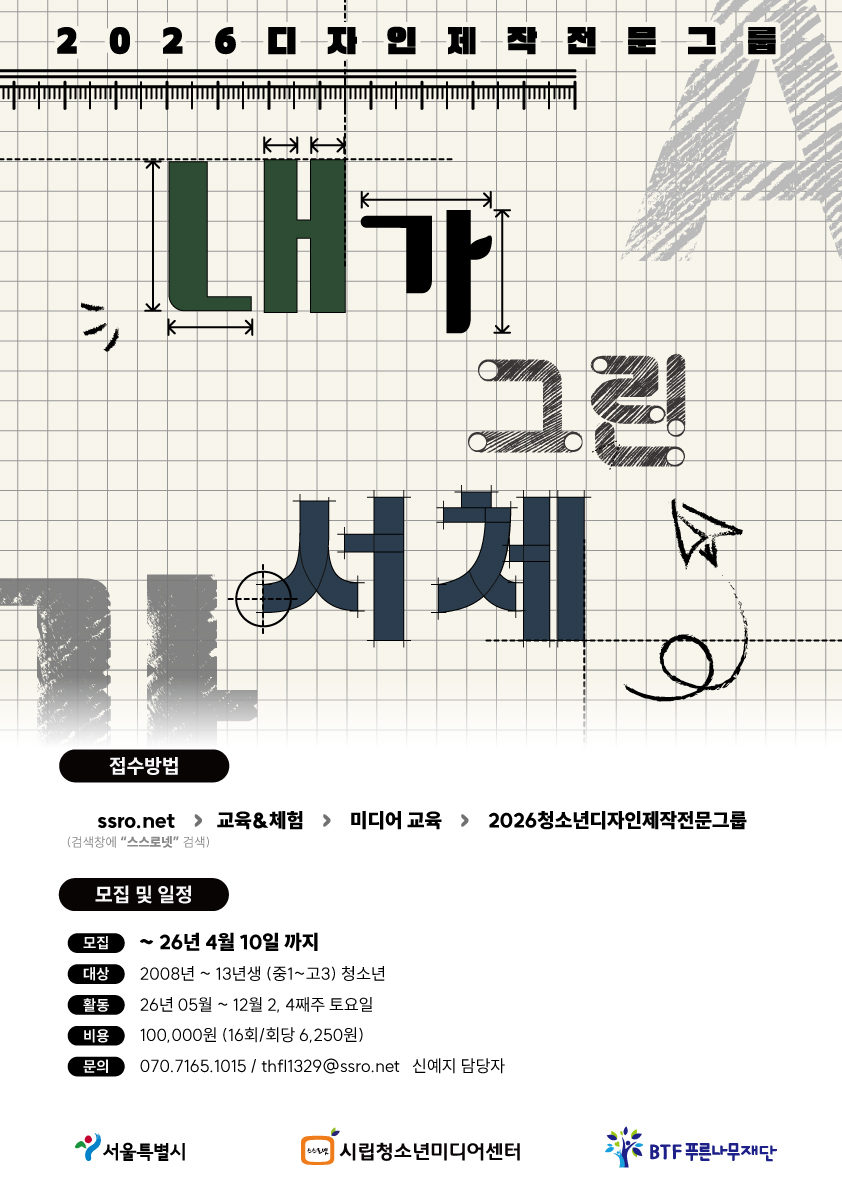 활동기간2026년 05-12월 2,4째주 토요일 총 16회 | 참가비용1인 100,000원(1회 6,250원 꼴)*전시관람활동시 입장료/체험비 별도 *8회차 이상 참여시 환불불가*서울특별시조례 제 8조 제 2항에 의거하여,감면대상에 해당하는 청소년의 참가비는 감면 합니다. |