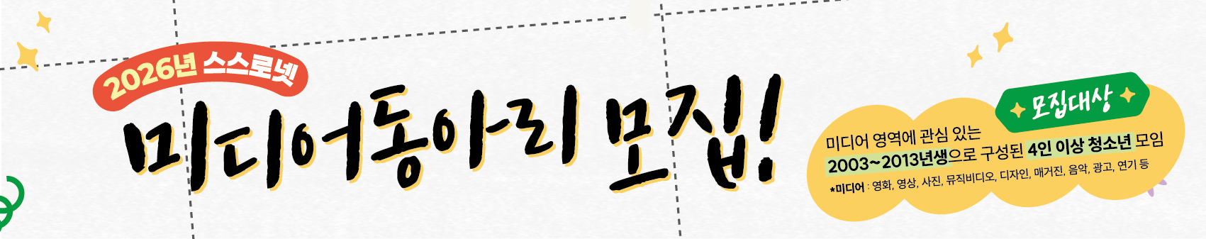 스스로넷에서 새로운 도약을 함께할 신규 동아리! *동아리 신청서 작성 : 하단 [양식 다운받기] 클릭 후 작성, 최종 신청 시 첨부 파일 등록 필수 ★☆2026년 신규 모집 일정 떴다!!☆★ 1. 모집 l 신규 동아리 (미디어영역 - 영상/영화/사진/광고/디자인/작곡/연기 등) 2. 대상 l 콘텐츠 제작에 관심 있는 청소년(2003~2013년생)으로 구성된 4인 이상 모임 ※학교 소속 자율 동아리, 방송부 신청가능! 3. 기간 l 추후 안내 - 2025년 12월 1일 ~ 2026년 1월 31일(사전 모집) - 2026년 2월 1일 ~ 3월 14일 23:59까지(정규 모집) * 인터뷰 일정 : 개별 연락 후 협의 4. 작성 l 양식 작성 - 신청하기 클릭 - 활동 경력란 링크 첨부 *작성한 신청서 링크(유스내비 링크) 제출/명단 정확하게 확인 필수 5. 혜택 l ▶ 스스로그룹 멤버십 - 공간 대관비, 미디어 장비 대여 무료 (월 30만원 상당) - 관련 교육 및 워크숍 제공 : 그룹원 니즈에 맞춘 커리큘럼 - 동아리 맞춤 컨설팅 : 미디어 관련, 팀 운영, 공모전 지원 - 영화 전문가, 방송 및 다큐멘터리 전문가의 작품 제작 자문 - 스스로넷 홈페이지 동아리 홍보(동아리 부원 모집 지원) ▶ 스스로그룹 커뮤니티 : 프로젝트 협업 및 다양한 공모전, 사업 정보 교환을 위한 소통 창구 ▶ 스스로그룹 이벤트 : 온&오프라인 발대식 - 축제, 우수 동아리 시상 등 다채로운 이벤트 제공 ▶ 그 외 : 우수 동아리 선정 시 상품 및 활동비, 수상 기회 제공 6. 문의 l 미디어교육팀 동아리 담당자 070-7165-1020 카카오톡 ID : ssro1020