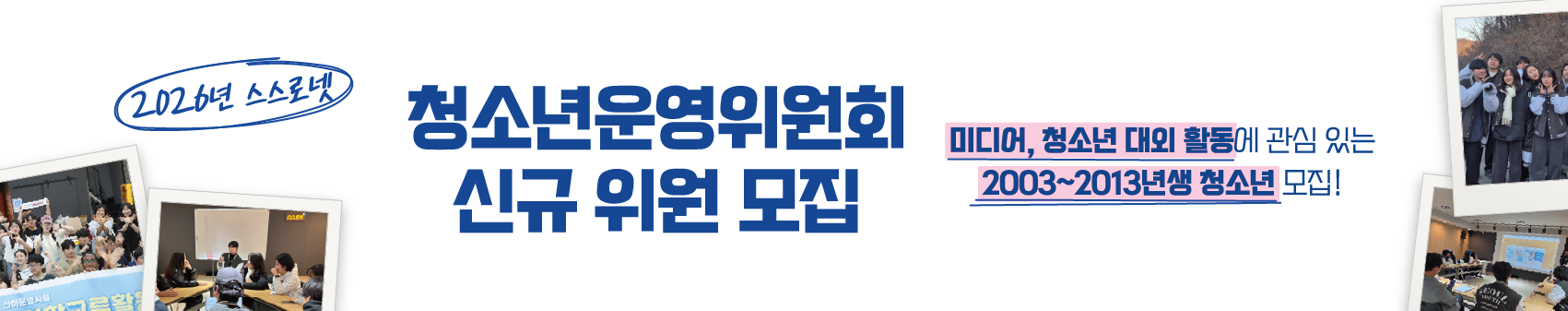 청소년들이 직접 청소년 시설 운영에 참여해볼 수 있는 기회! 서울시 유일의 미디어특화시설 스스로넷 <그루터기>는 2009년부터 시작되어 15년 동안 운영되고 있습니다. '미디어' 역량도 채우고, '기획 및 운영' 역량도 기를 수 있는 유일한 곳 🎊세계로 뻗어나가고자 포부를 갖고 있다면 #열정인들과함께 📝미디어축제, 행사 등 다양한 경험을 해보고 싶다면 #협업왕 #MC 📢청소년들을 위해 기관 운영에 의견을 제안하고 싶다면 #청소년짱 #청운위의특권 🎥다양한 미디어 활동, 콘텐츠 제작 활동을 해보고 싶다면 #다큐멘터리ing #미디어리터러시 1. 모집 l 2025년12월 1일 ~ 2026년 2월 28일 * 신청 확인 후 면접 일정 개별 안내 2. 신청 l 양식다운(하단)-신청서작성-신청하기 (※첨부파일에 신청서 첨부 필수, 제목은 "2026 스스로넷 청운위 지원신청서(양식)_이름"으로 기재) 3. 대상 l 14세 ~ 24세 청소년 누구나 4. 활동 l - 정기회의 : 월 1회 이상 다양한 안건들에 대한 논의 진행 (매 월 셋째주 토요일 오후) - 교류활동 : 국내외 청소년들과 다양한 관계 형성 및 네트워크 - 시설/프로그램 모니터링 : 연 2회 기관의 시설/프로그램 모니터링 후 개선 방안 논의 - 그루터기 워크숍 : 연 2회 스스로넷 청운위로서 역량 강화를 위한 교육 및 관계형성을 위한 활동 - 청소년 욕구조사 : 연 1회 요즘 청소년들의 트렌드 및 욕구 조사 후 프로그램에 반영 - 기관장 간담회 : 연 2회 안건들에 대해 직접 기관장님께 전달 및 질의응답 - 스스로그룹 동아리 연합행사, 재단 교류 활동, 콘텐츠 기획 및 제작 활동 등 5. 혜택 l - 나 뿐만 아니라 내 친구들을 위한 스스로넷을 만들어가는 기회 - 일정 활동에 대해 봉사활동 확인서 발급 - 우수활동 위원 표창 기회 - 위촉장 및 활동확인서 발급 - 미디어 관련 역량 강화 교육 6. 문의 l 김재영 담당자 / 070-7165-1020 / 225221101@youth.seoul.kr / 카카오톡 ssro1020